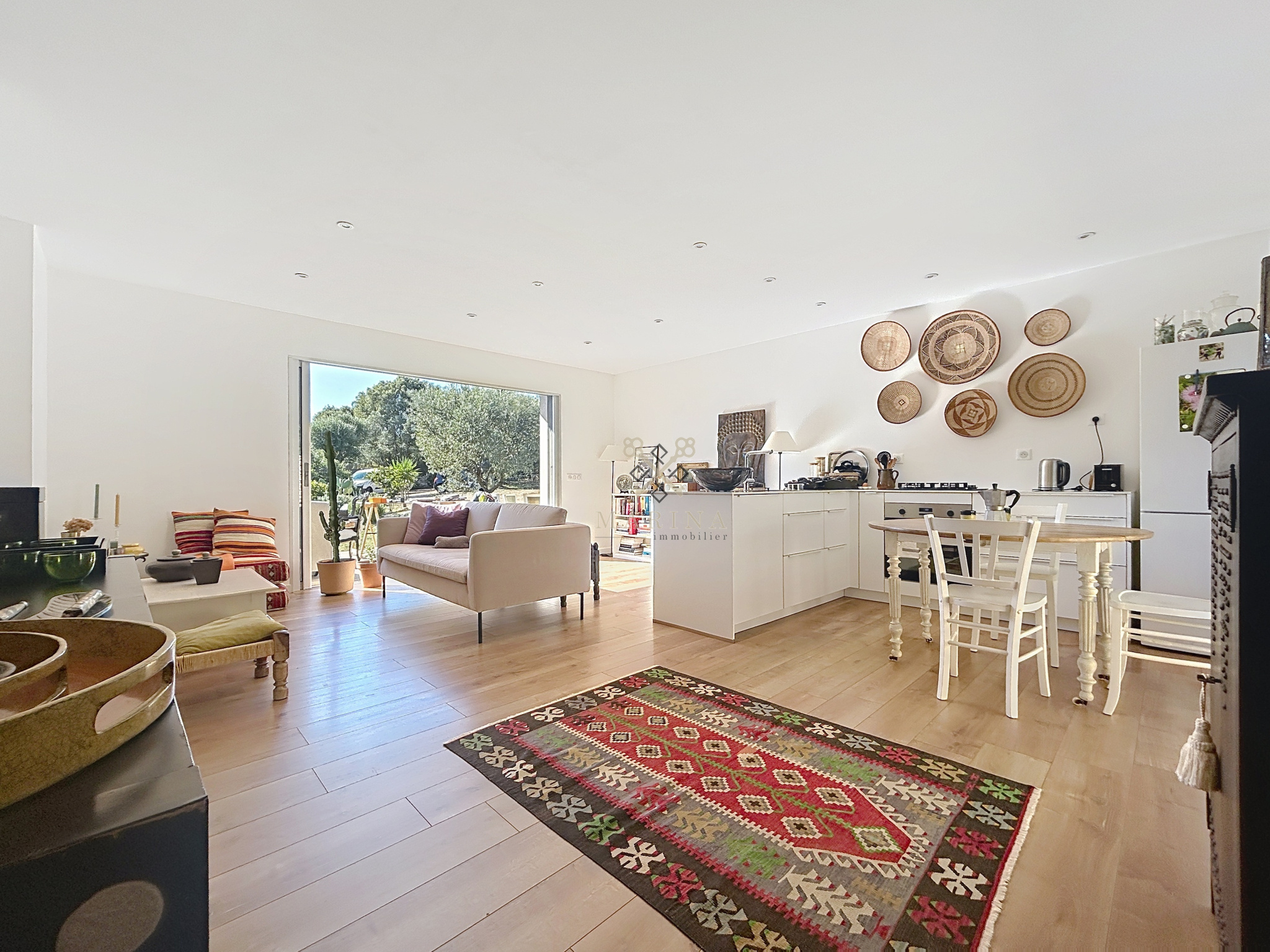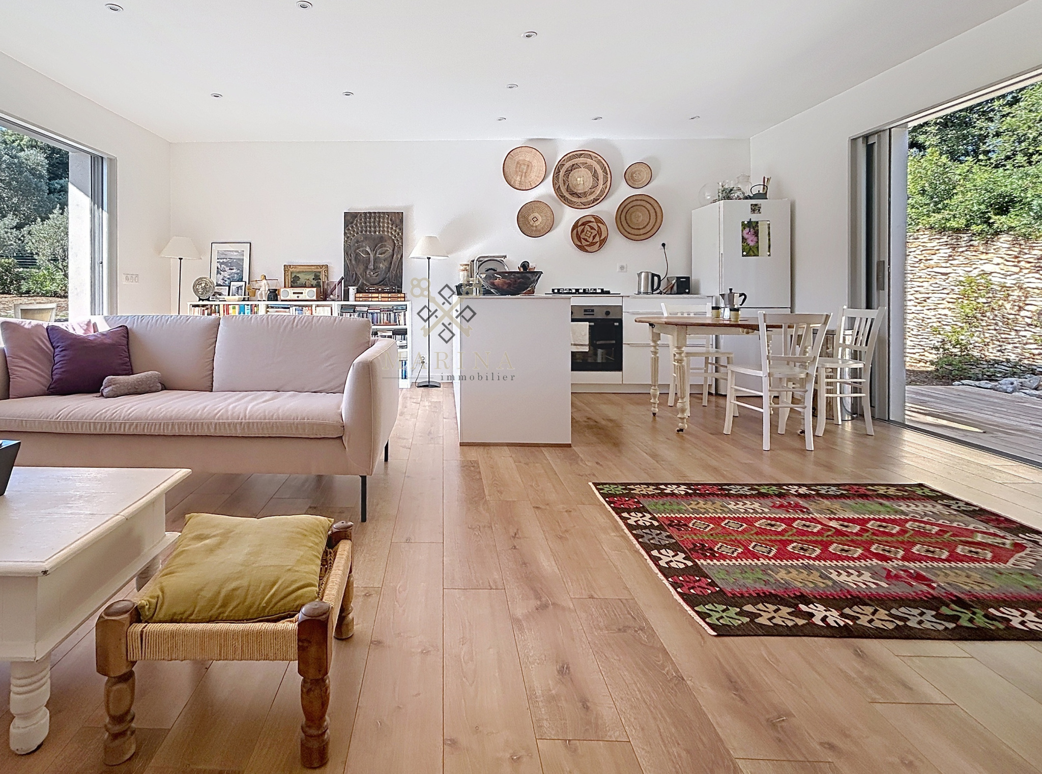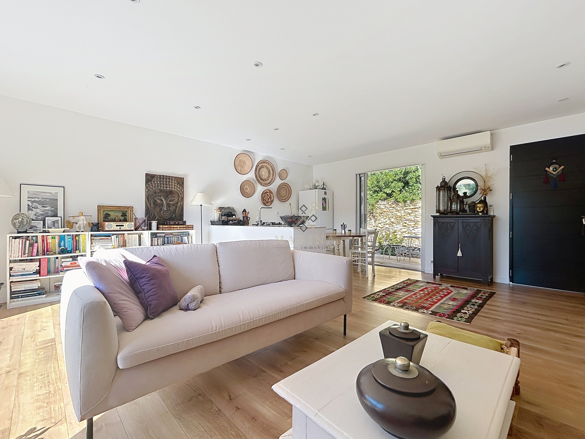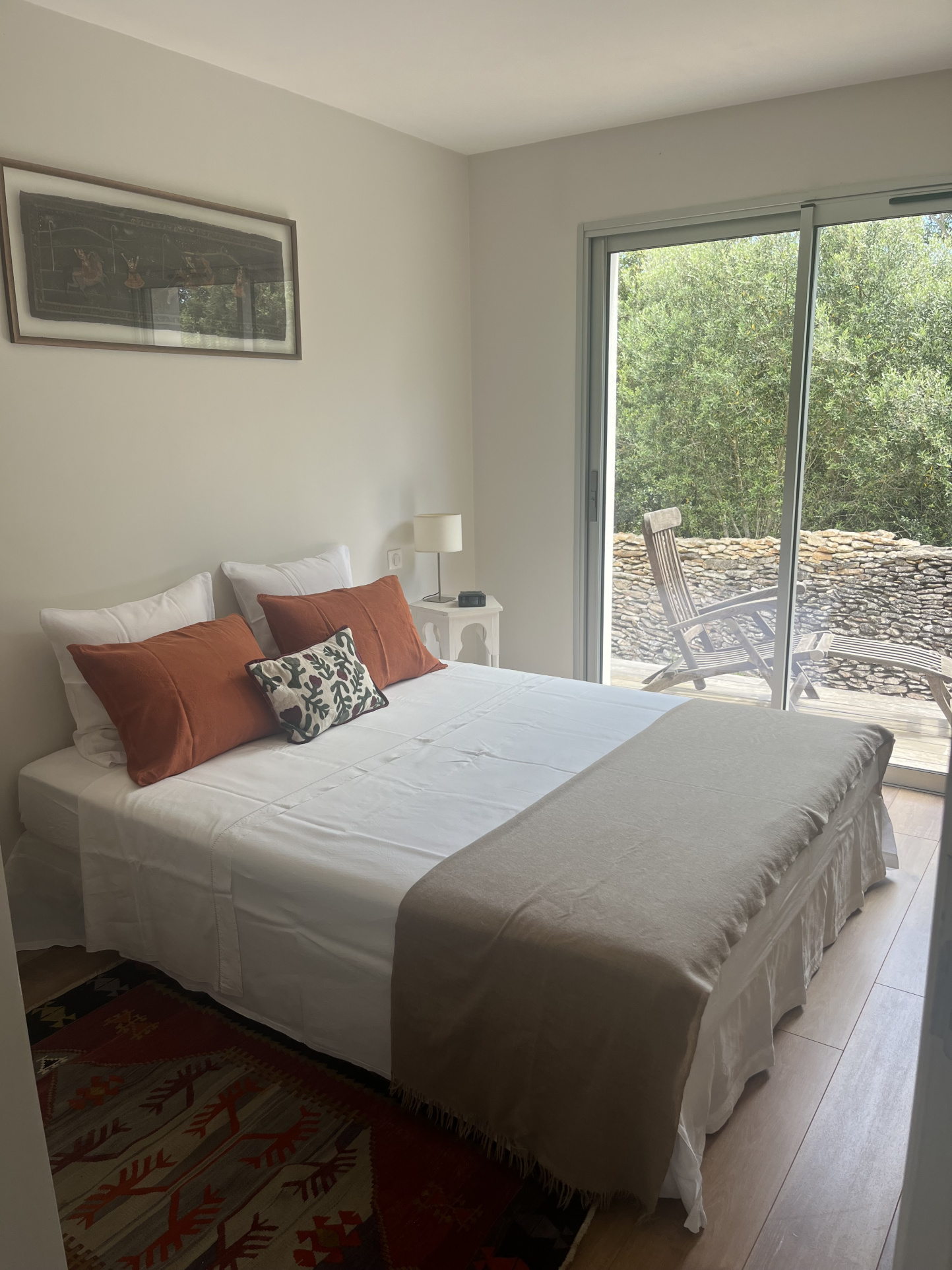 La maison principale, construite en 2021, offre environ 66 m2 de surface habitable. Son grand séjour lumineux avec cuisine ouverte s’ouvre largement sur la terrasse grâce à une grande baie vitrée à galandage, créant une belle continuité entre intérieur et extérieur. Deux chambres, bien agencées, une salle de bain élégante et un wc indépendant complètent cet intérieur convivial et harmonieux.